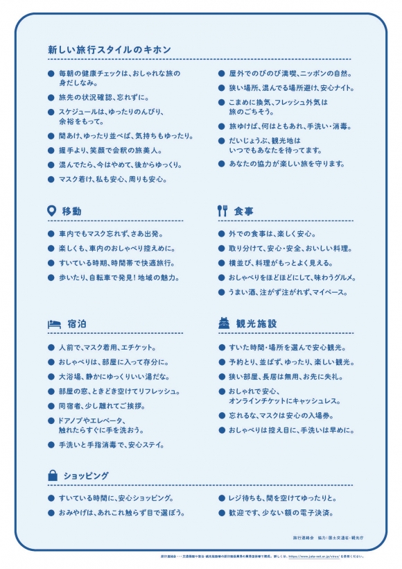 観光関連事業者が示す、旅行者視点での感染防止のための留意点をまとめた「新しい旅のエチケット」を参考に「感染しない!させない!」旅をお楽しみください。